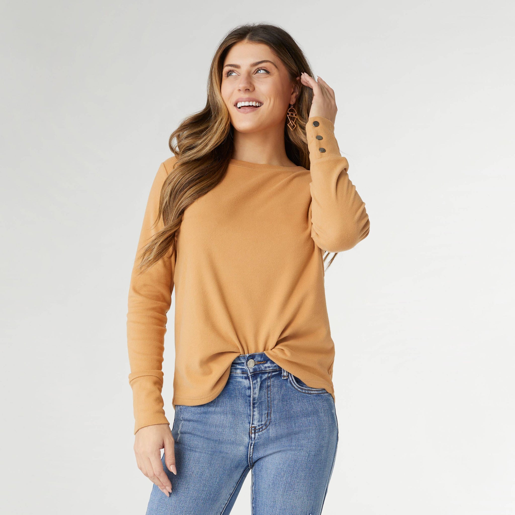 Stay effortlessly chic in our Alexis Top! With its super soft texture, snap cuffs, and long sleeves, this top is an essential piece for any outfit. Whether you're running errands or meeting friends for brunch, you'll look and feel fabulous in this top. Materials: Polyester/Spandex.