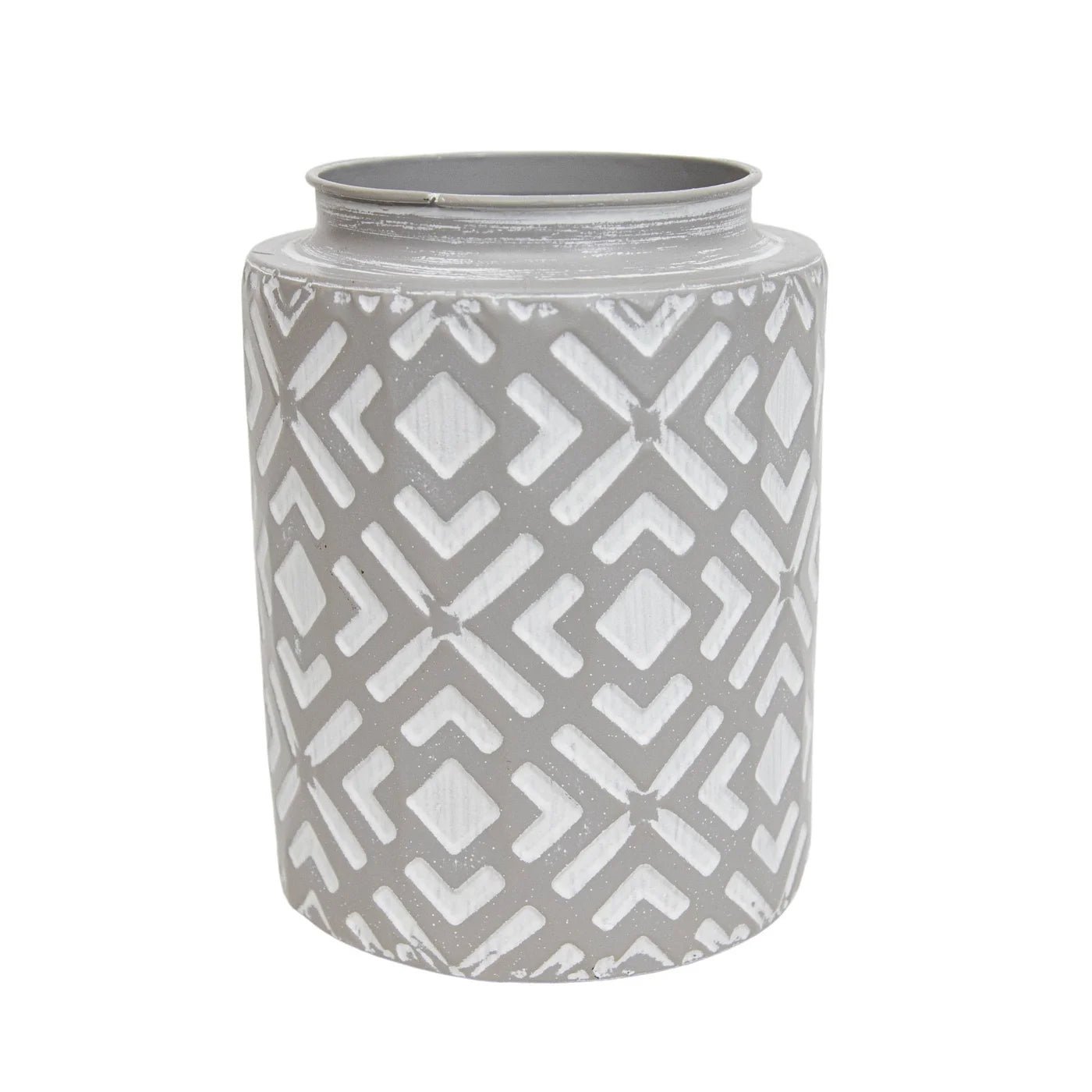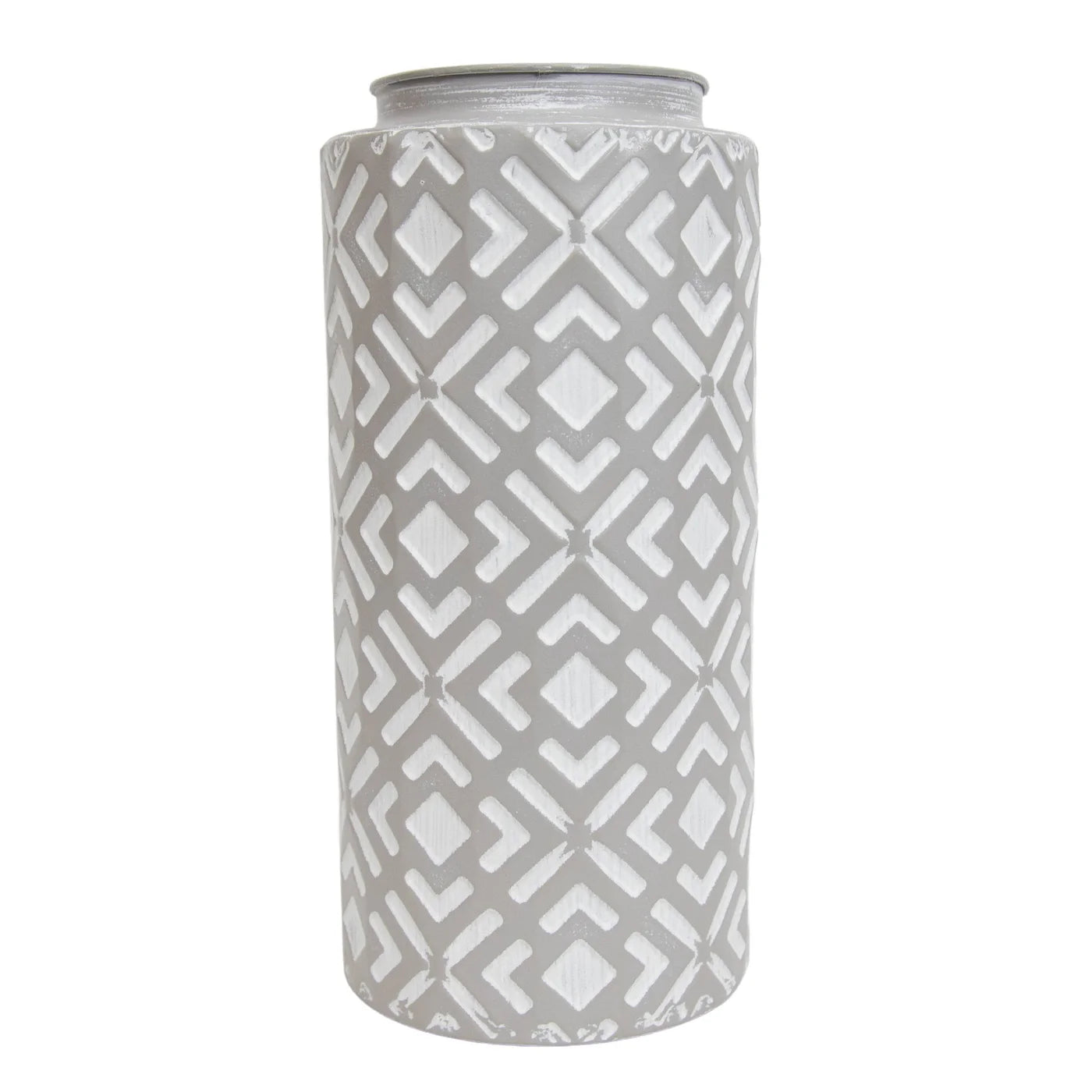 If you're looking for texture, we've got it with this vase exclusively from Foreside Home & Garden. The modern style vase has a light gray metal finish with white geometric patterning around it, creating an interesting and textural whitewash effect. Pairs wonderfully with faux branches or smaller greens inside to accent a shelf or mantel.