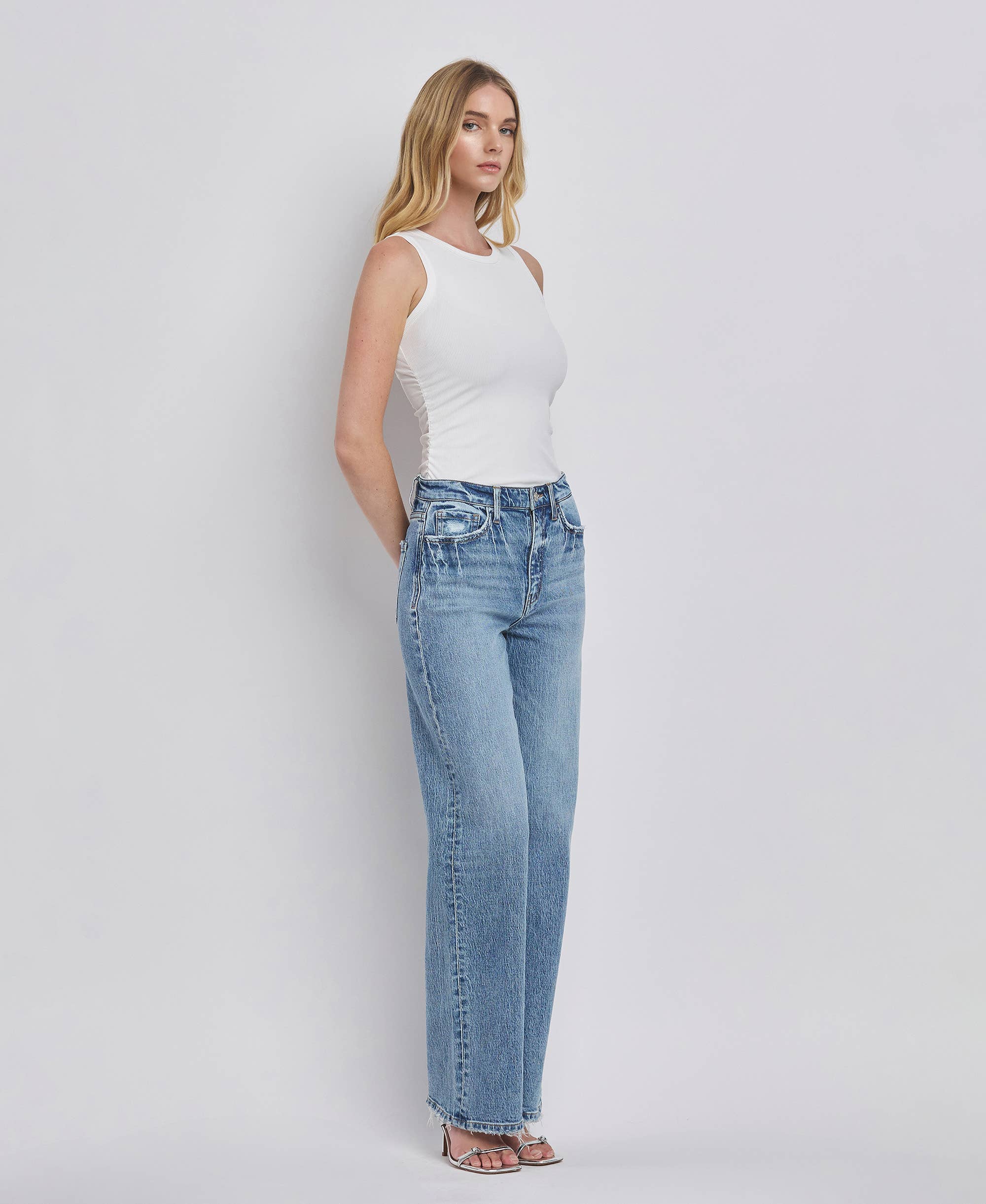 COMFORT STRETCH DENIM, SUPER HIGH RISE WAIST, LIGHTLY DISTRESSED DETAIL, FINISHED HEM, FULL LENGTH, 90'S WIDE JEANS