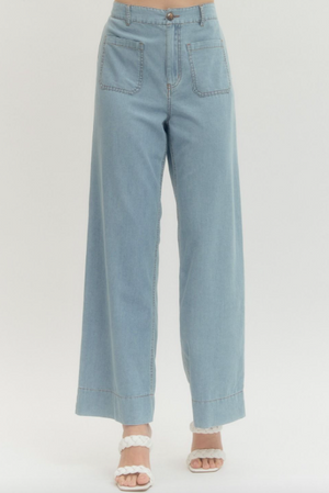 Denim wide leg pants featuring front patch pockets and stitched waistband