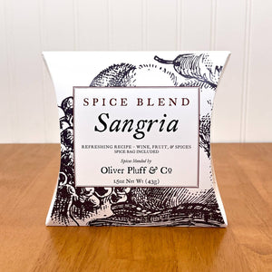 Sangria Spice Blend A Refreshing Recipe of Wine, Fruit & Spices Description: From its humble roots in Spain and Portugal, Sangria has grown to become a popular party drink the world over. Typically it is created from red wine, spices, and cut fruit, but recipes vary widely. Sangria is based on traditional wine punch served across Europe for hundreds of years, beginning in the Middle Ages. Ingredients: cinnamon sticks, cloves, allspice, star anise Size/Type: 1.5oz spices - Brews 1.5 Gallons Shelf Life: 3 years Hand packaged & blended by Oliver Pluff & Co. in Charleston, South Carolina