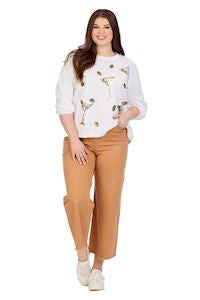 Description: Cotton blend sweatshirt features sequin or tinsel applied details. One size fits most. Measures approximately 25 1/2" from shoulder to hem.