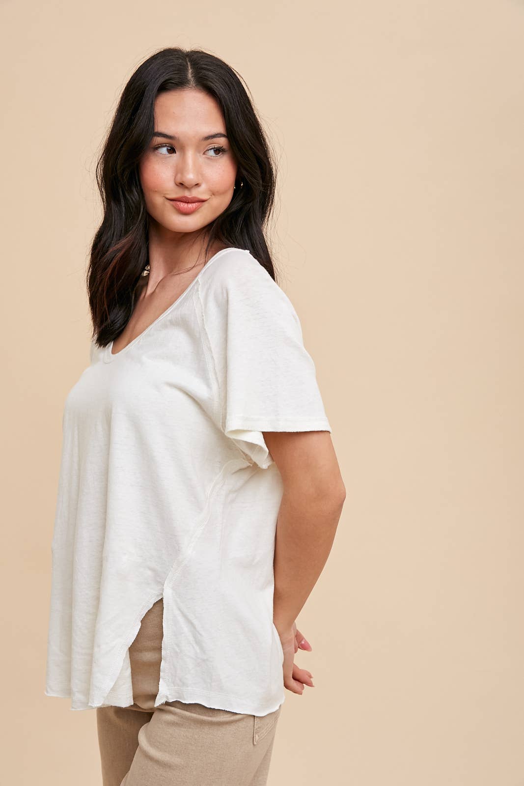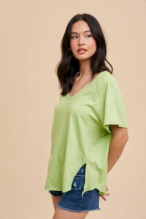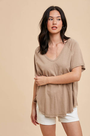 COTTON/LINEN BLEND SCOOP NECK TEE FEATURES RAGLAN SLEEVES, SIDE SLIT DETAIL, RAW EDGE HEM AND SEAMS, V SHAPED LOW BACK, AND GARMENT WASHED FOR THAT VINTAGE LIVED IN FEEL.