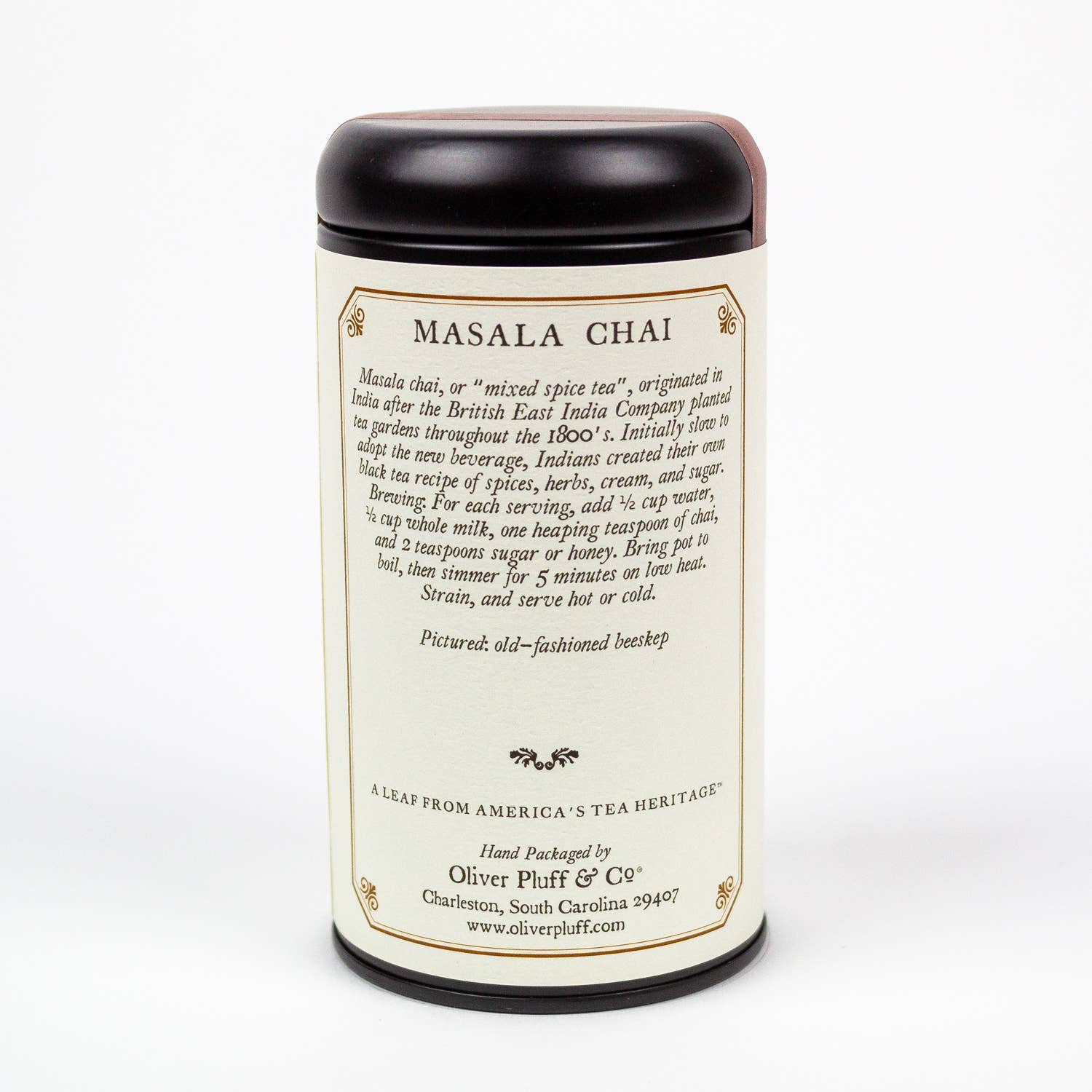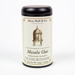 Masala Chai- 20 Pyramid Style Teabags in Signature Tea Tin Description: Masala Chai, literally "mixed-spice tea," originated in India, but has become a favorite in tea and coffee houses worldwide. Spicy and strong black tea blend. Served hot or cold, but always creamy and puckeringly sweet. Chai is also sometimes called "spiced black tea." For this item we have placed our amazing Masala Chai Tea in a non-GMO, plant-based Non-Woven, fully biodegradable teabag for your convenience. Ingredients: black tea, ginger, cinnamon, cardamom Size/Type: 20 Pyramid style teabags sealed in matte black signature tea tin Shelf Life: 3 Years Hand Packaged by Oliver Pluff & Co. in Charleston, South Carolina
