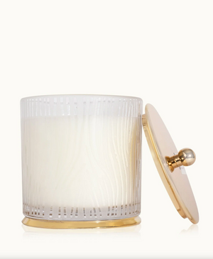 Bring sophistication to any room with the luminous Frosted Wood Grain Large Poured Candle. Featuring frosted wood grain detail, stunning gold lid, and gold-edged base, enjoy the beautiful warm glow and iconic just-cut forest fragrance of Frasier Fir.