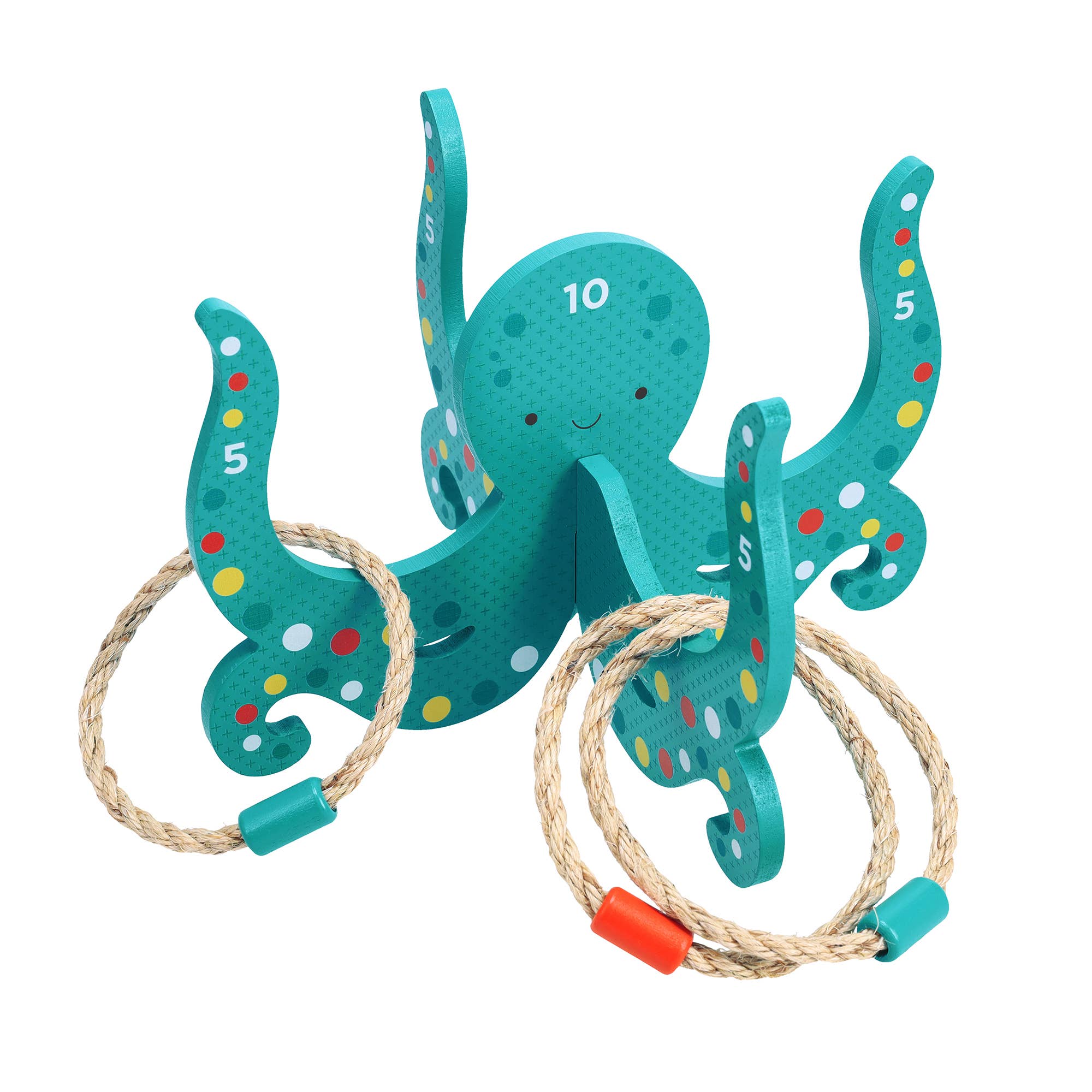A playful octopus loves to be the center of attention in this fun take on the classic game of quoits. Simply slot the wooden pieces togetherÑno tools requiredÑand toss a ring! Earn five points if it lands around an arm or ten points for the head.
