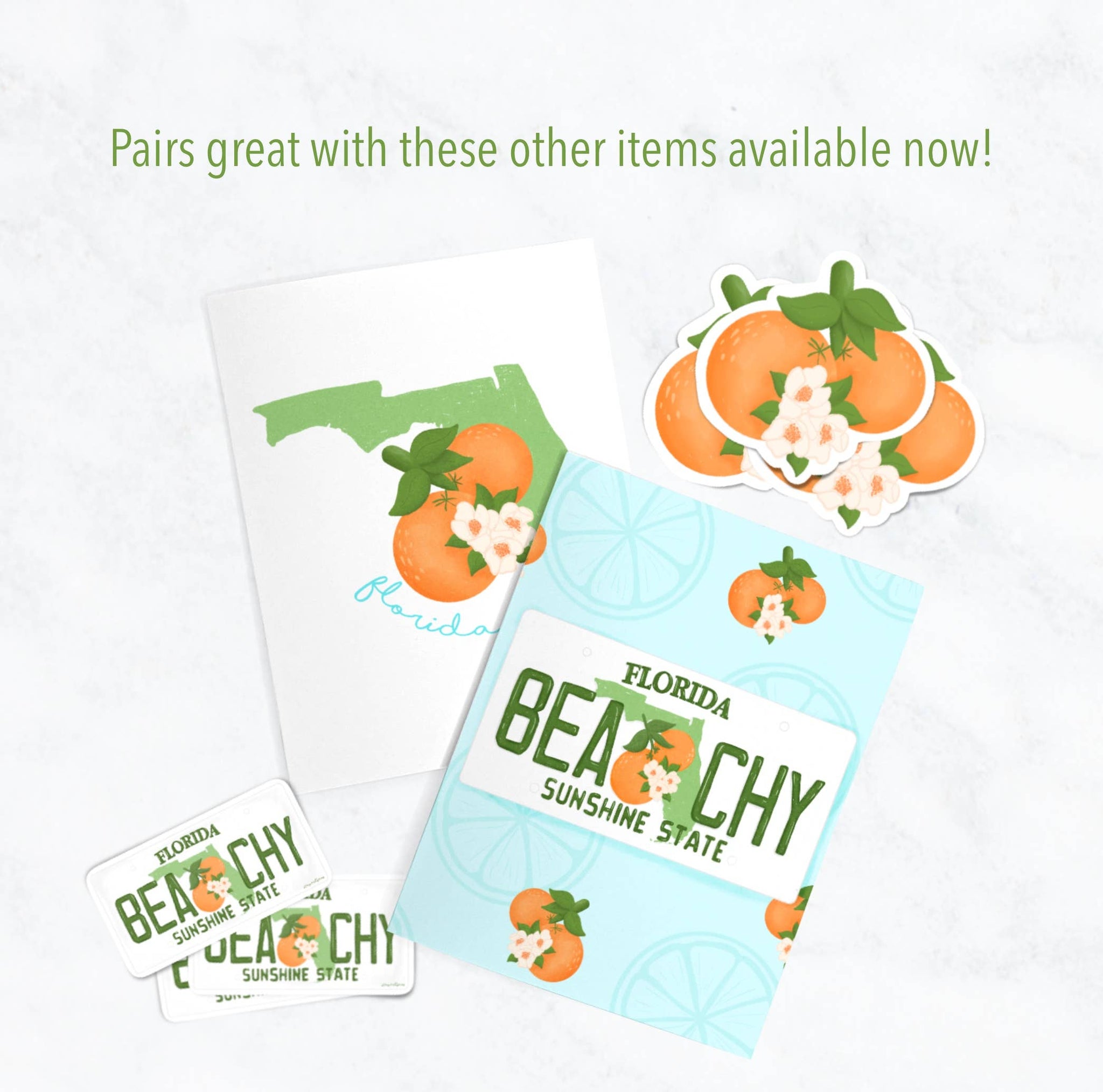 Inspired by our 25 Sweetpeas Most Popular Card we have a BEACHY Florida License plate Sticker featuring the iconic Florida Oranges!