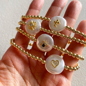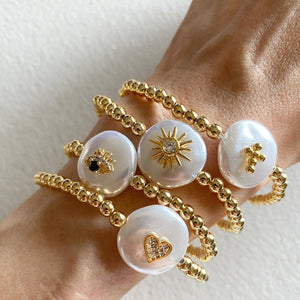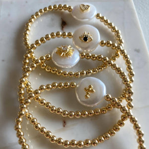 Stunning pearl disc with a beautiful design. Easy to wear elastic/stretch bracelet. 14k gold plated