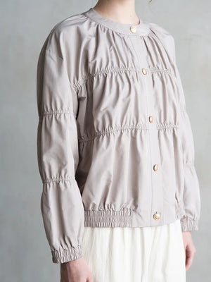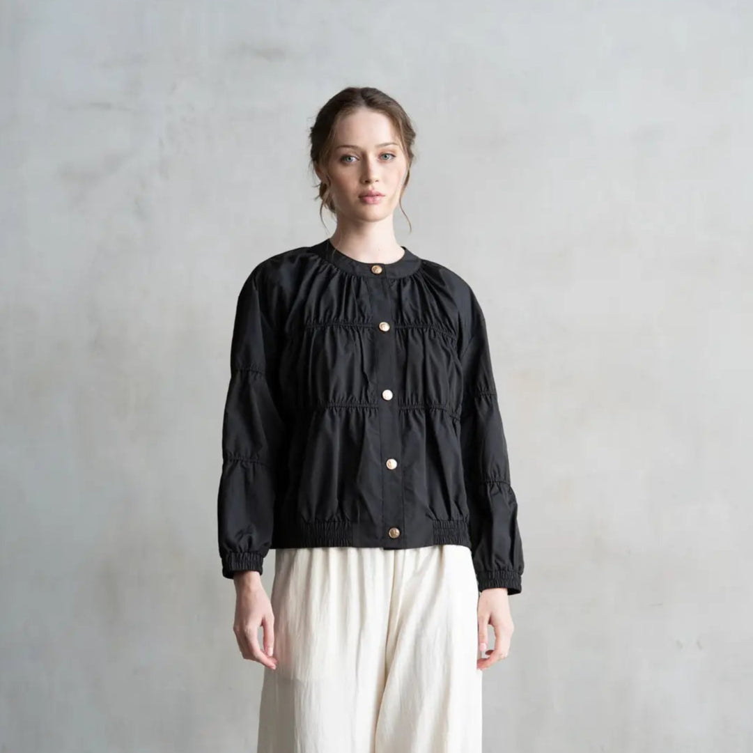 This jacket features a tiered design with soft gathers that create understated volume. It has a crew neckline and a front button closure. The long puffed sleeves are finished with elastic cuffs for a secure fit. Made from lightweight fabric, it’s perfect for layering. The cropped length includes an elasticated hem, offering a gentle blouson shape. Contrast buttons add a polished detail. Available in Jet Black or Khaki.
