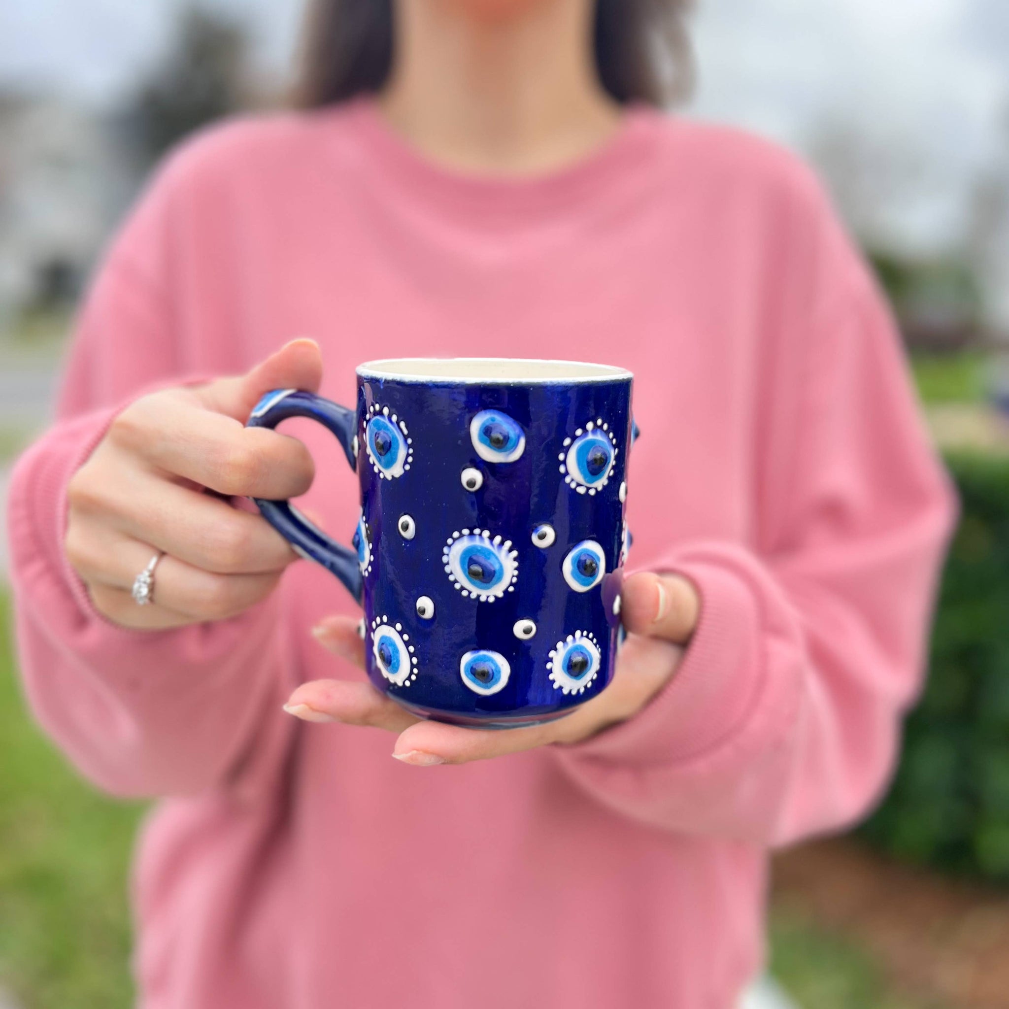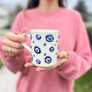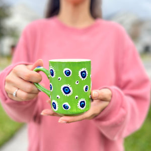 These cute ceramic mugs are hand painted in Turkey. They are dishwasher and microwave safe. You will be receiving 1 different color that are painted with evil eye design. We offer free replacements for any items that gets delivered chipped or broken. Please just message us and we will make it right for you. Each Sold Separately.