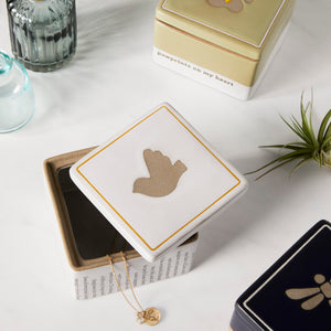 Inspired by a bit of nostalgia, this handcrafted stoneware keepsake box is a unique and gorgeous way to protect tiny treasures. Plus, it will brighten up any tabletop with meaning!