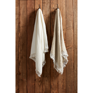 The macrame muslin throw is crafted from 100% cotton, making it a lightweight and cozy throw blanket. Its exquisite macrame fringe trim adds a touch of sophistication to any room. Cleaning this throw is a breeze as it is machine washable. Just toss it in the washing machine with similar colors on a cold cycle, and lay it flat to dry. If you prefer a polished appearance, a gentle warm ironing will do the trick. This throw is incredibly versatile, effortlessly enhancing the warmth and style of your home decor.