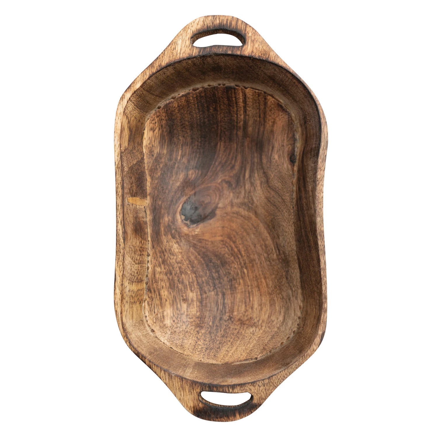 This farmhouse-inspired tray showcases a masterfully carved solid wood silhouette with 2 attached handles. This piece is food safe. Hand wash only. Made from mango wood. Measures 9.5" L x 5" W x 2" H.