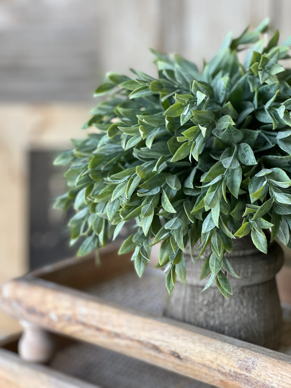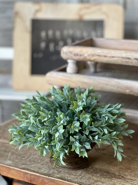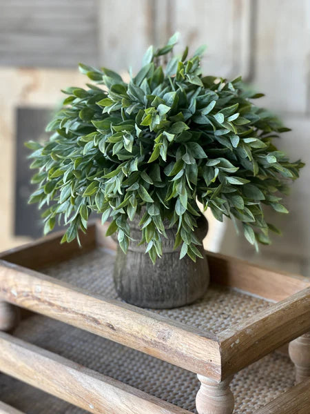 The Rainwashed sphere features a multitude of spear shaped leaves with a powdered finish that creates a lush bed of greenery.