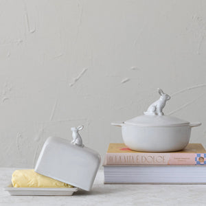 This baker is a unique addition to any kitchen. Made out of stoneware, this white 7" round x 5-1/2"H baker holds 4 cups and features an elegant rabbit finial on the lid.