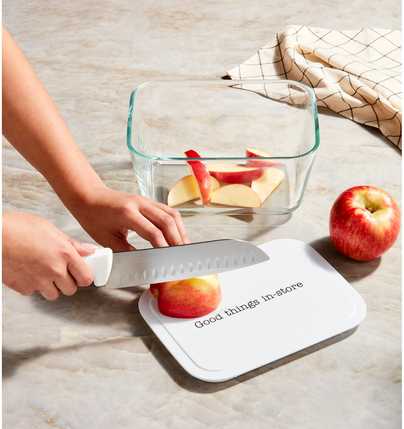 Good things are in store with this versatile kitchen accessory, featuring a glass container and a plastic cutting board lid. The glass container is ideal for storing and organizing food items, while the plastic cutting board lid provides a convenient surface for chopping and preparing ingredients.